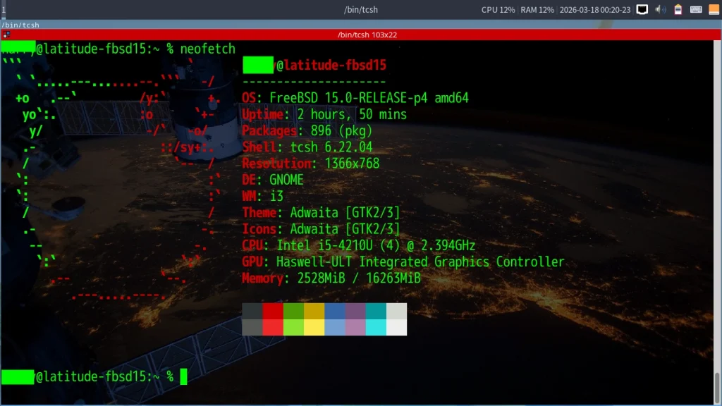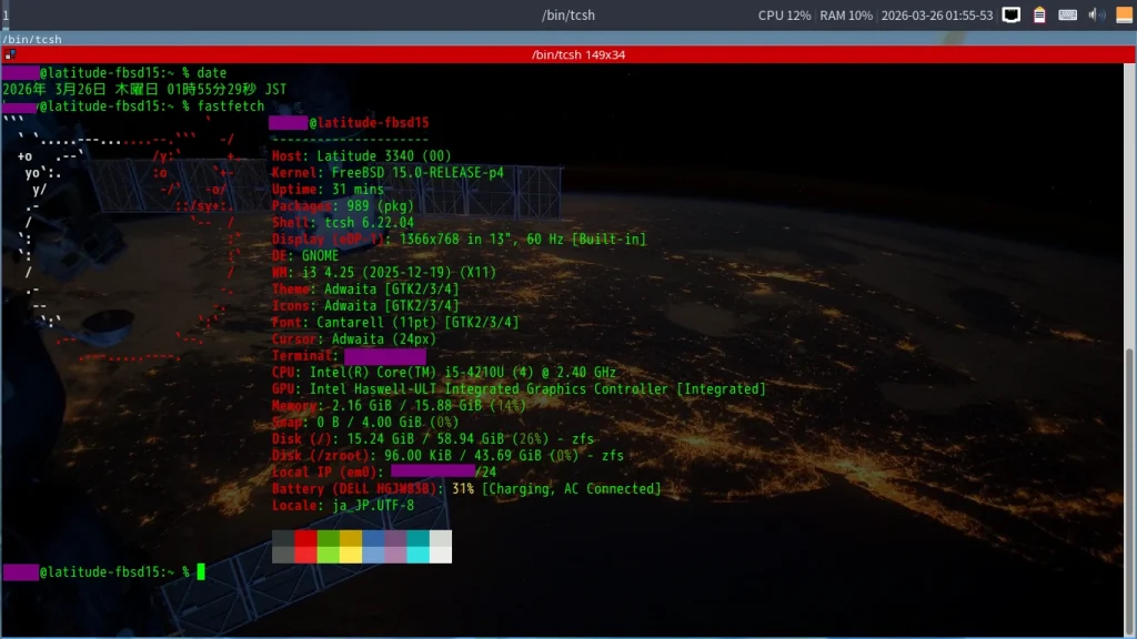 インストールと設定が終わったあとのi3 Window Manager on FreeBSD 15.0-RELEASE on DELL Latitude 3340。